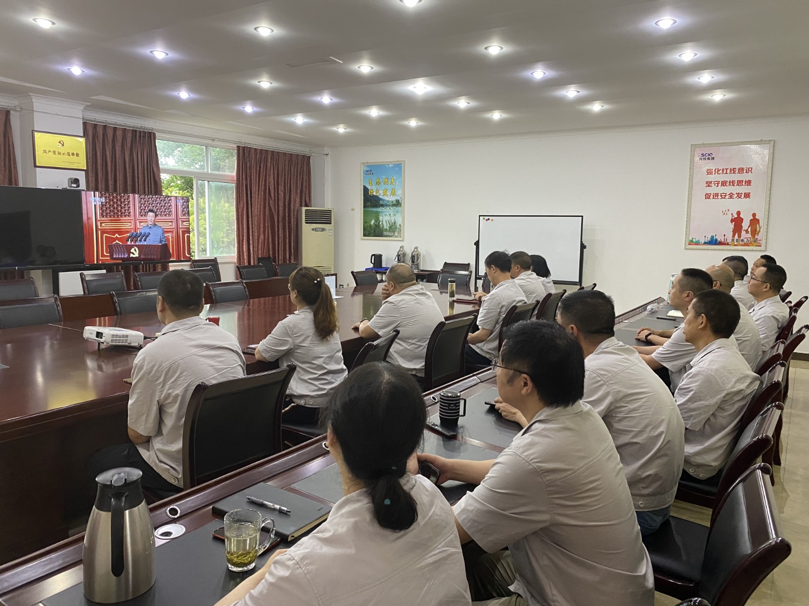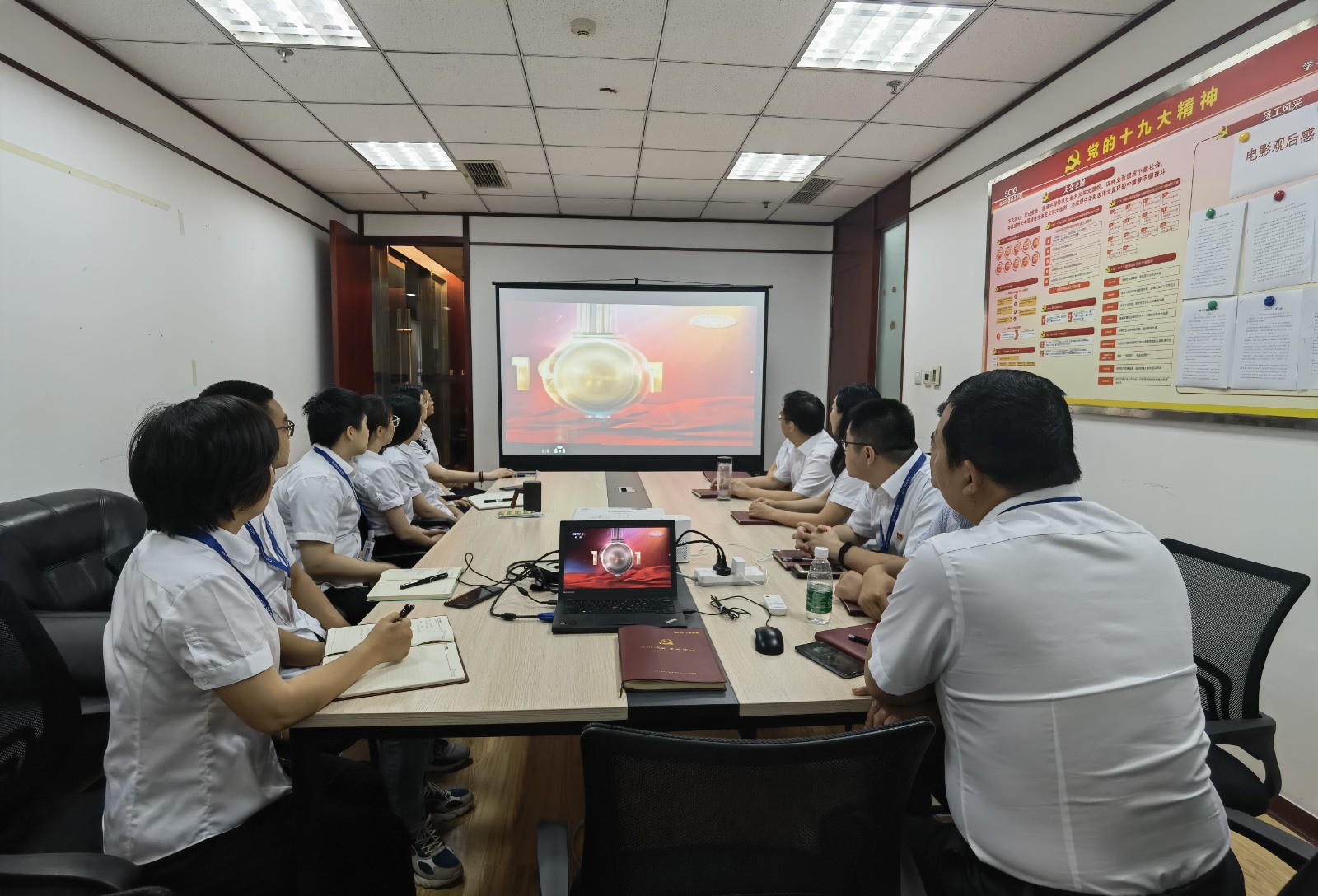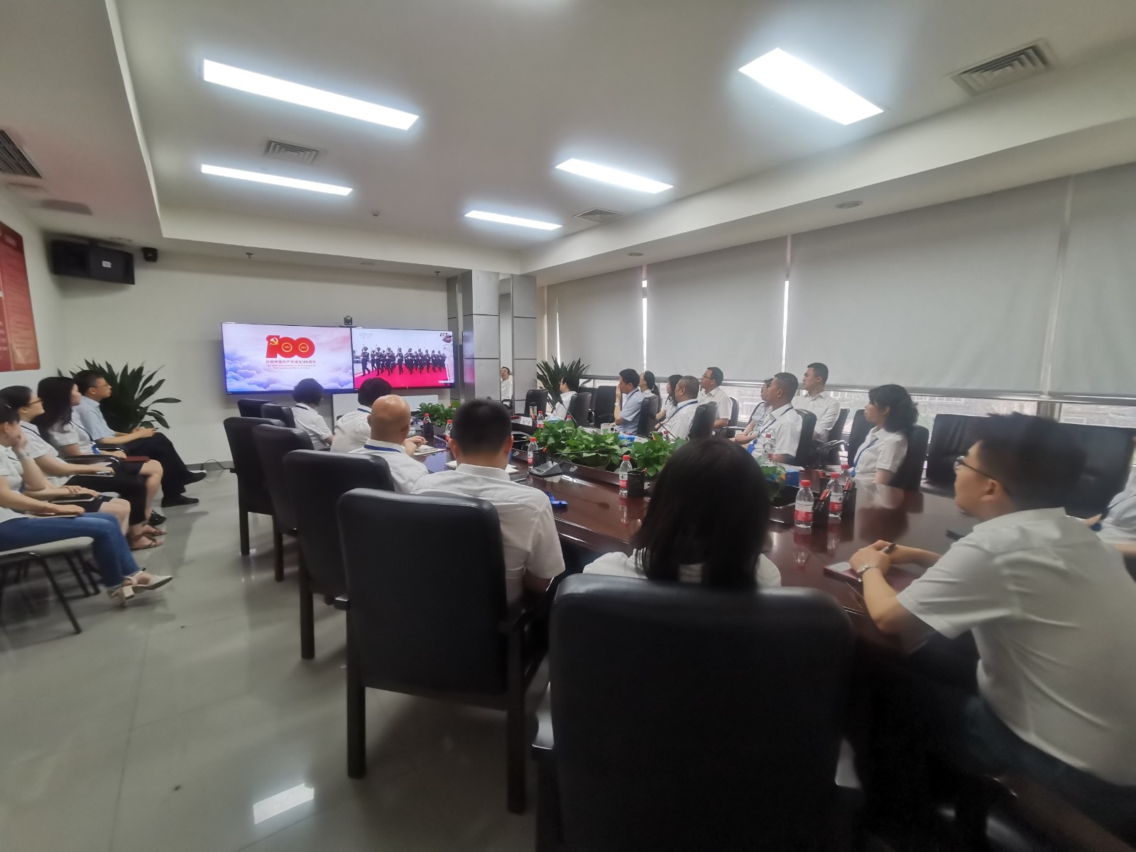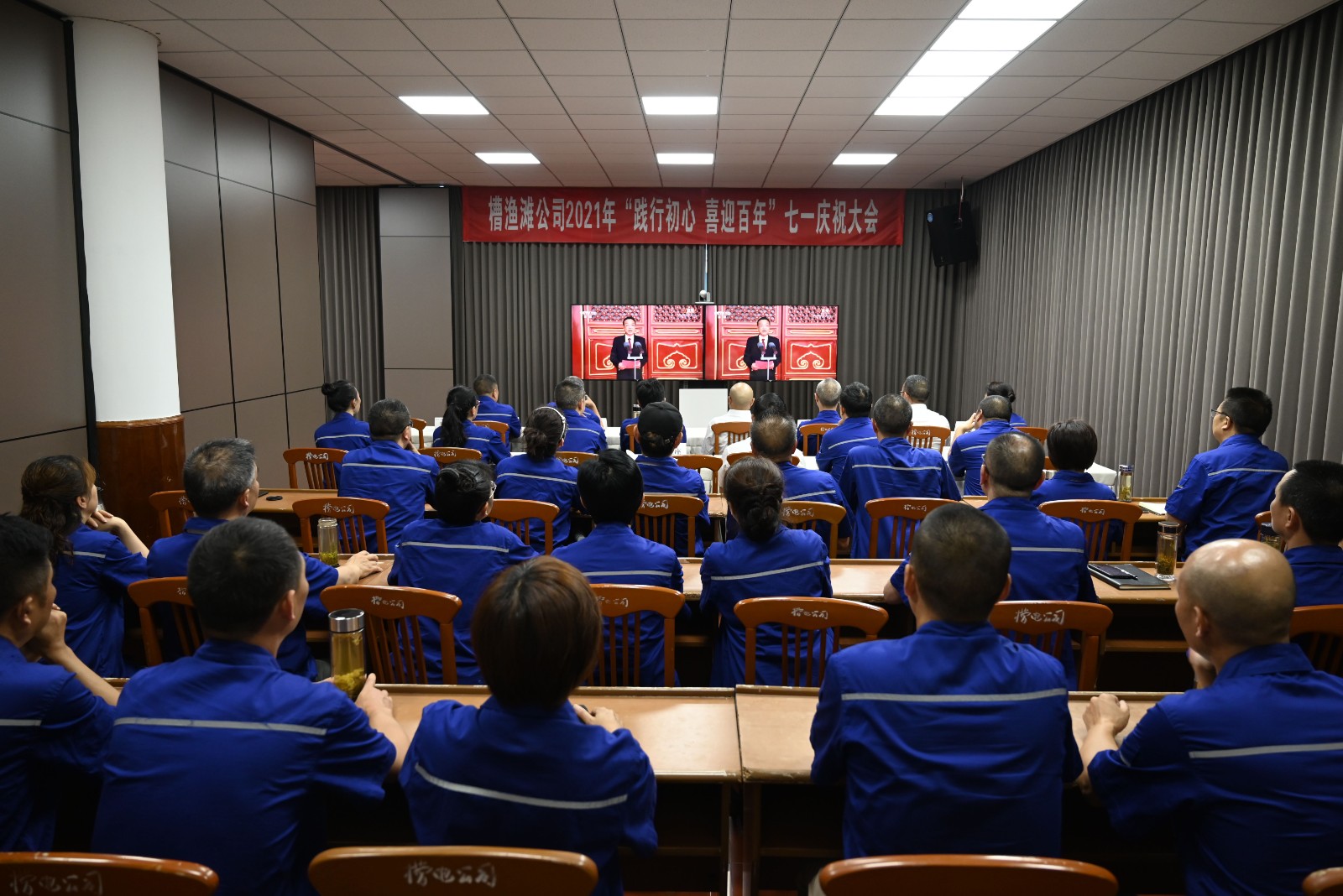 視頻中,習近平總書記鏗鏘有力的聲音深入人心,從1921到2021,中國共產黨帶領中國人民,從風雨飄搖中一路走來,百年征程波瀾壯闊,百年初心歷久彌堅。當《國歌》《國際歌》相繼響起的時刻,會場人員紛紛起立,跟隨激昂的旋律整齊高唱。當回顧“四史”贊頌黨的偉業之時,會場人員滿溢出對黨的感恩和身為黨員的自豪。