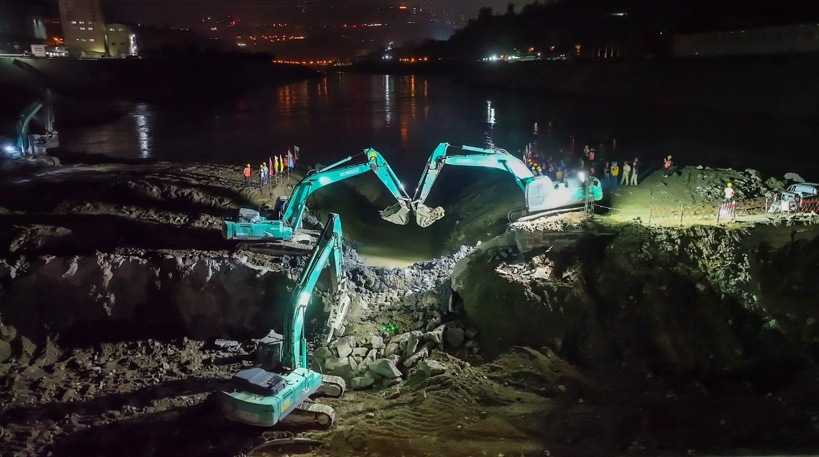 金秋十月,川投能源銀江水電站工程建設“進度條”持續刷新。10月25日晚上,隨著川投能源副總經理、導流明渠截流指揮長徐孝剛一聲令下,十余臺挖掘機在二期上游圍堰右岸進行破口開挖,奔騰的金沙江水隨即涌入主河床廠房與溢流壩上游,充水平壓后江水經溢流壩段流向下游,銀江水電站成功實現分流。這一重要進展為按期完成導流明渠截流打下堅實基礎,也標志著銀江水電站首臺機組投產發電正式進入倒計時階段。